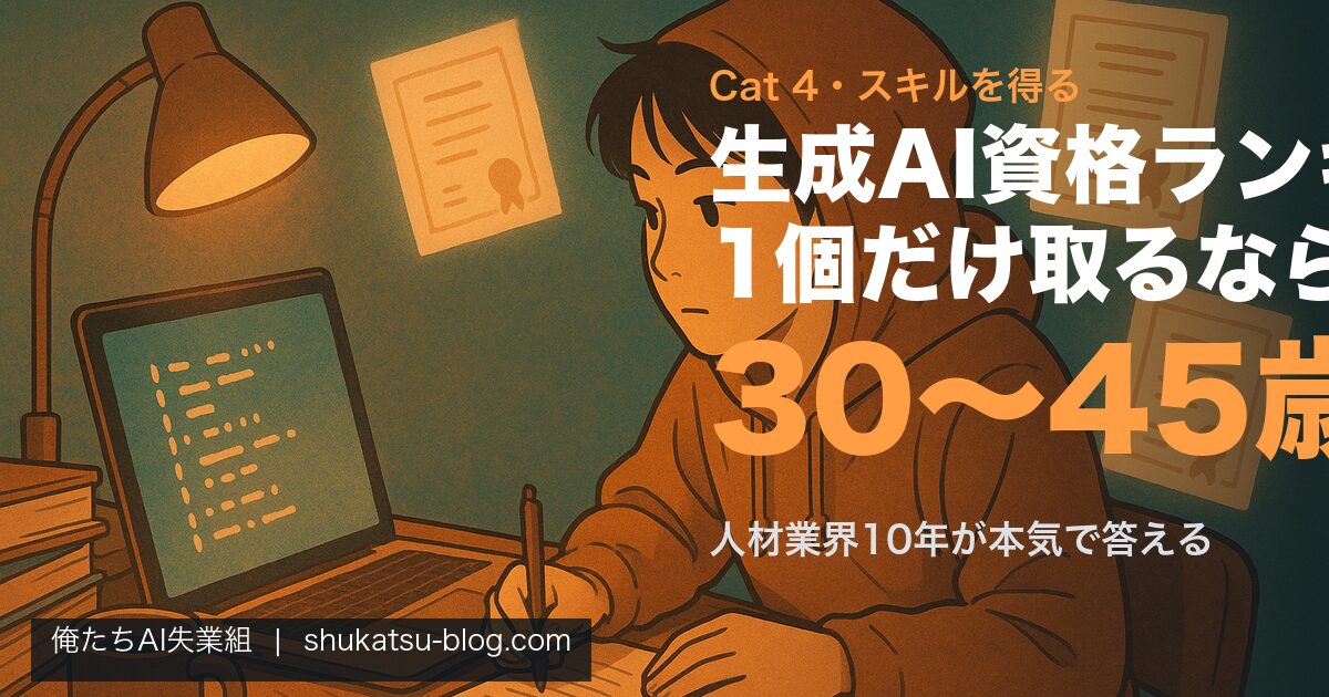 最初に大事な話をしときます。30〜45歳のおっさん(俺含む)が、AI失業対策で資格を取る目的って何かというと、「AIを使える側の人間です」っていう最初の証明書を手に入れることです。それ以上でもそれ以下でもない。